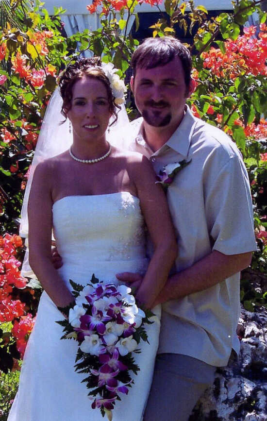 The four-tiered wedding cake, a creation of the groom's grandmother, Beverly Geiger, Uniontown, Kan., and mother, Pat Ramsey, featured a fountain, and was decorated with fresh tropical flowers and shells, and was topped with a nosegay of tropical flowers. Punch, mixed nuts, and cream cheese mints completed the table.