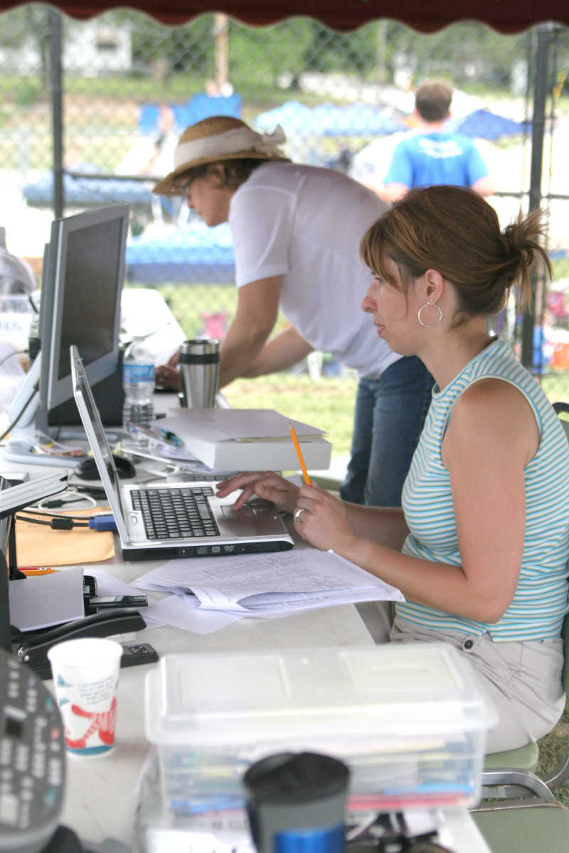 Kori Bowen, front, and Leva Richmond, back, tabulate the swim meet results. -