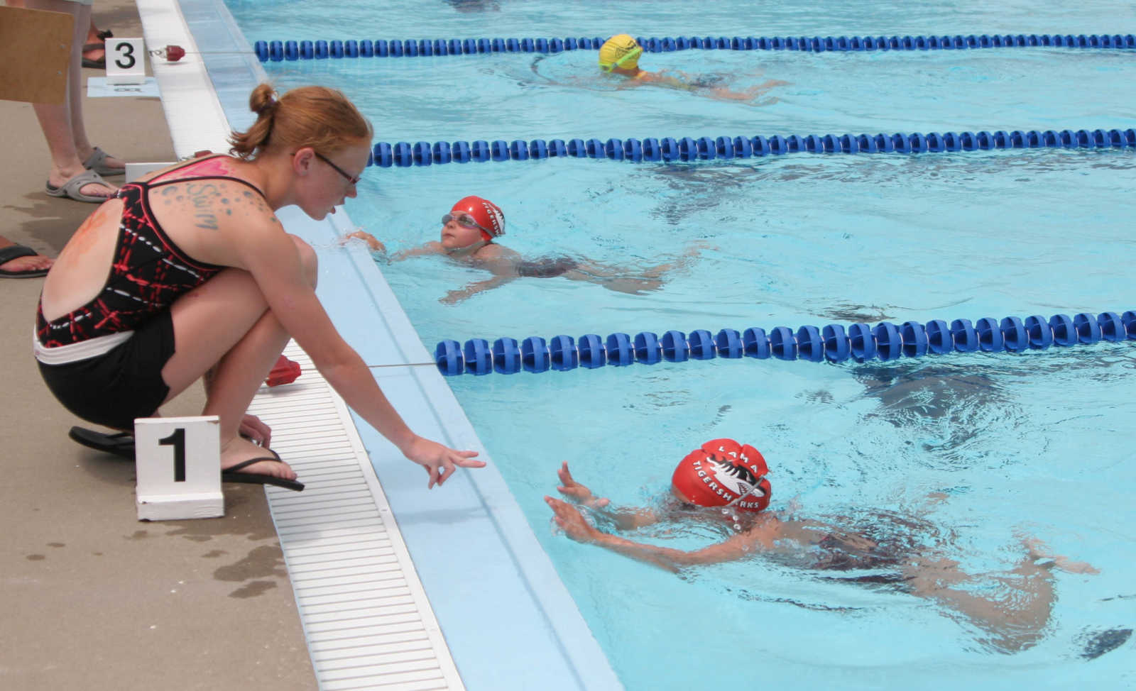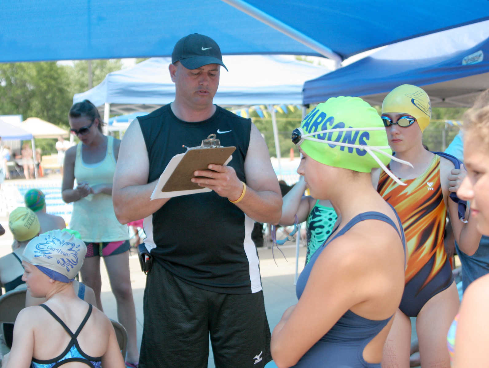 Pat Eador runs the bullpen to keep the swimmers in each heat in the correct order. -