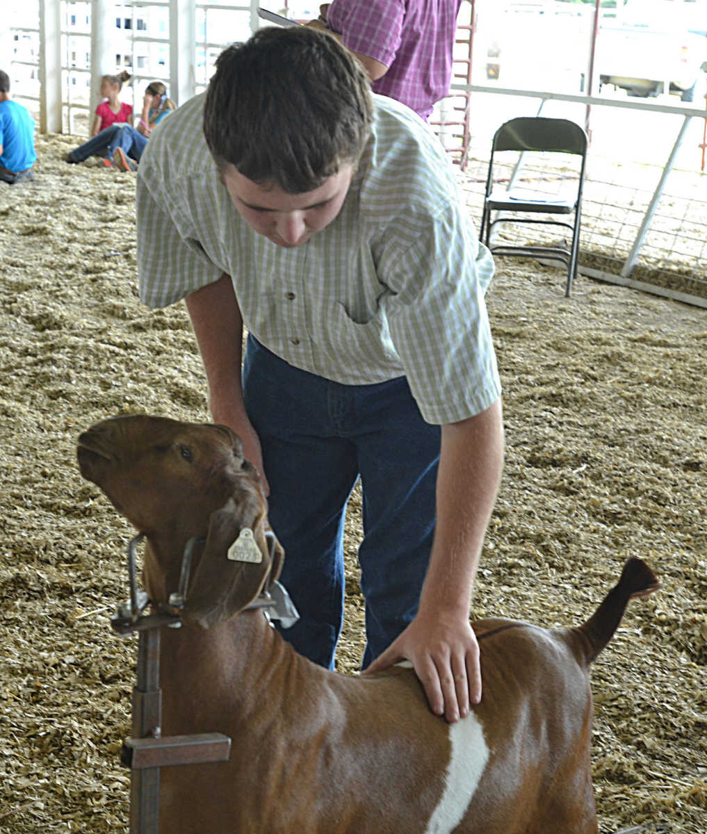 Calye Comstock, of Deerfield, inspects a goat in the Tri-Co Livestock Judging Contest on Saturday. -