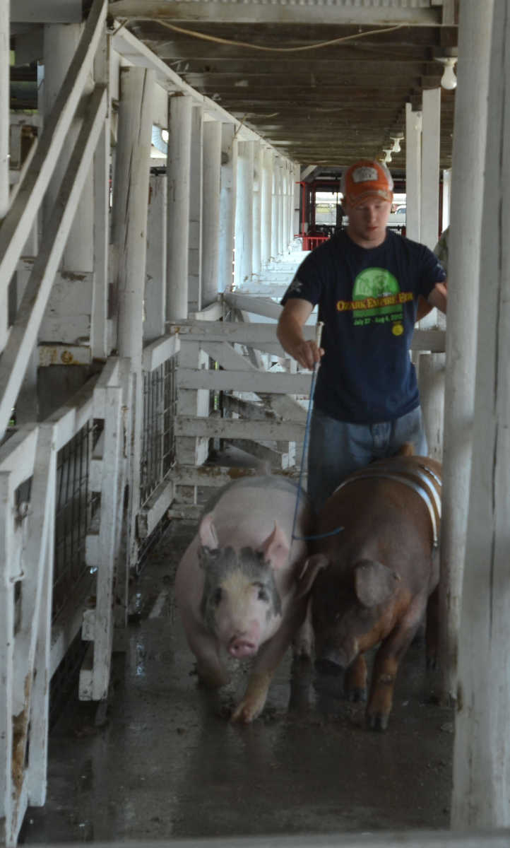 Dylan Murray, of Nevada, urges pigs forward for judging before the Tri-Co Livestock Judging Contest on Saturday.