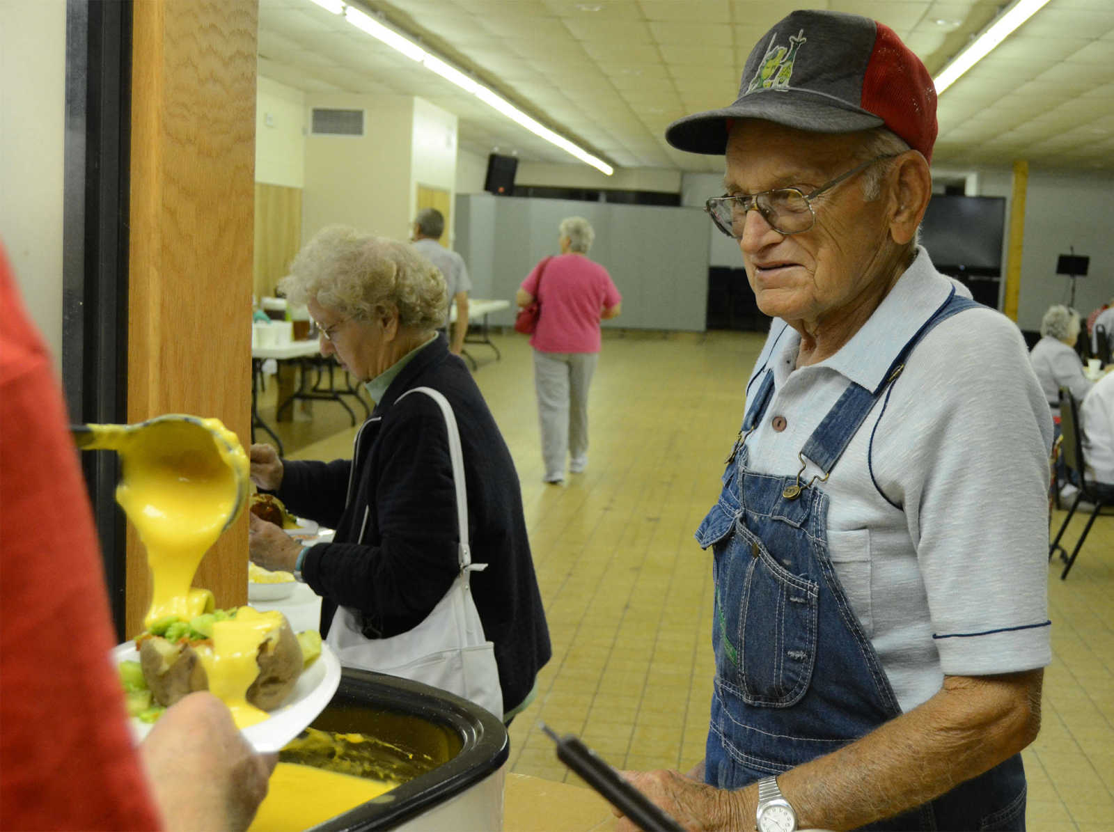 George Kuhlman gets plenty of cheese on his potato at the Habitat for Humanity's potato luncheon at First Christian Church on Wednesday. -