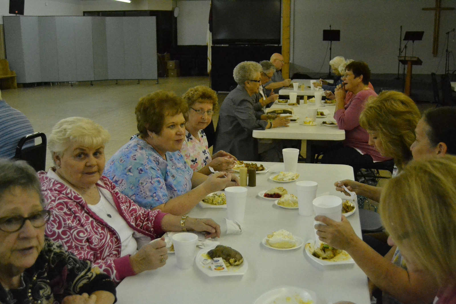 People gather to enjoy potato and pie at the Habitat for Humanity's potato luncheon at First Christian Church on Wednesday.