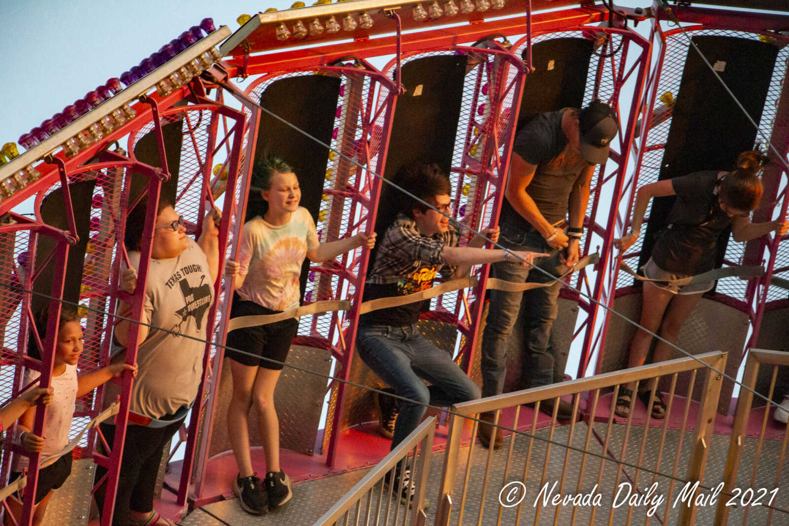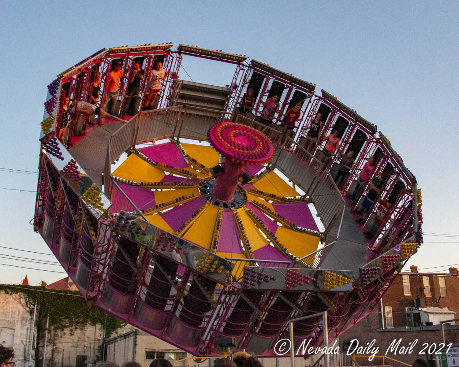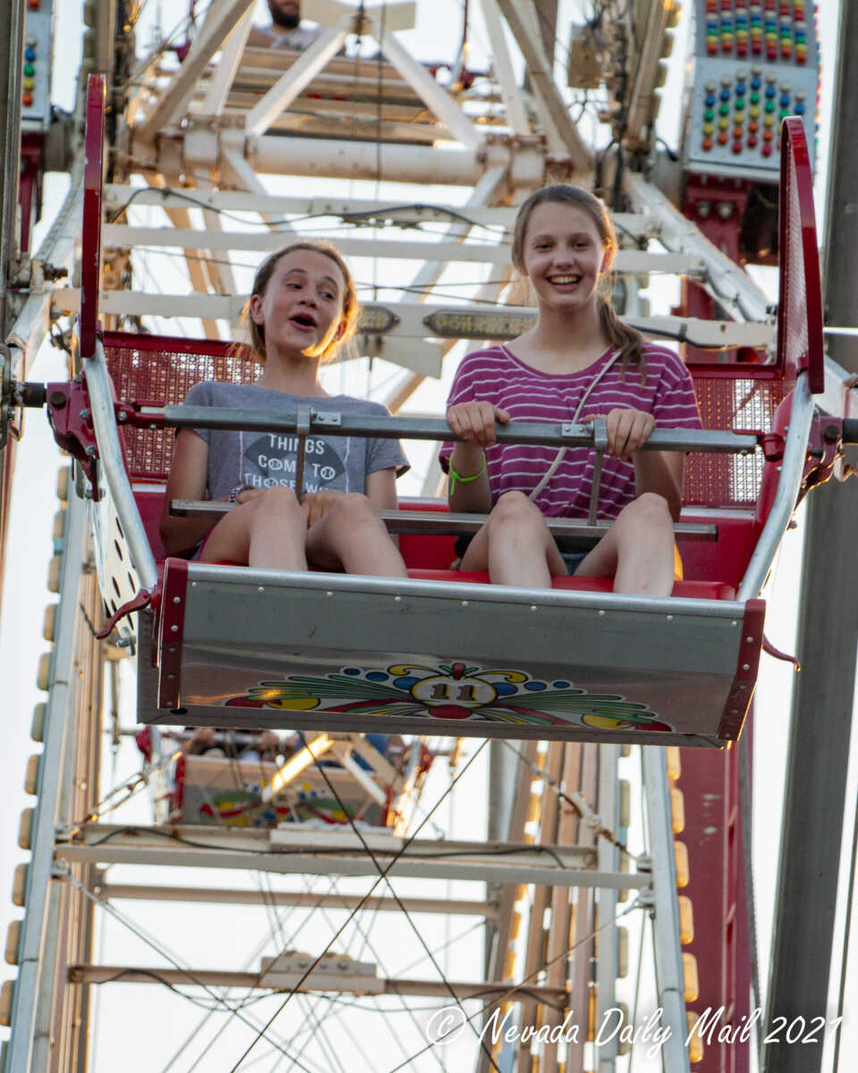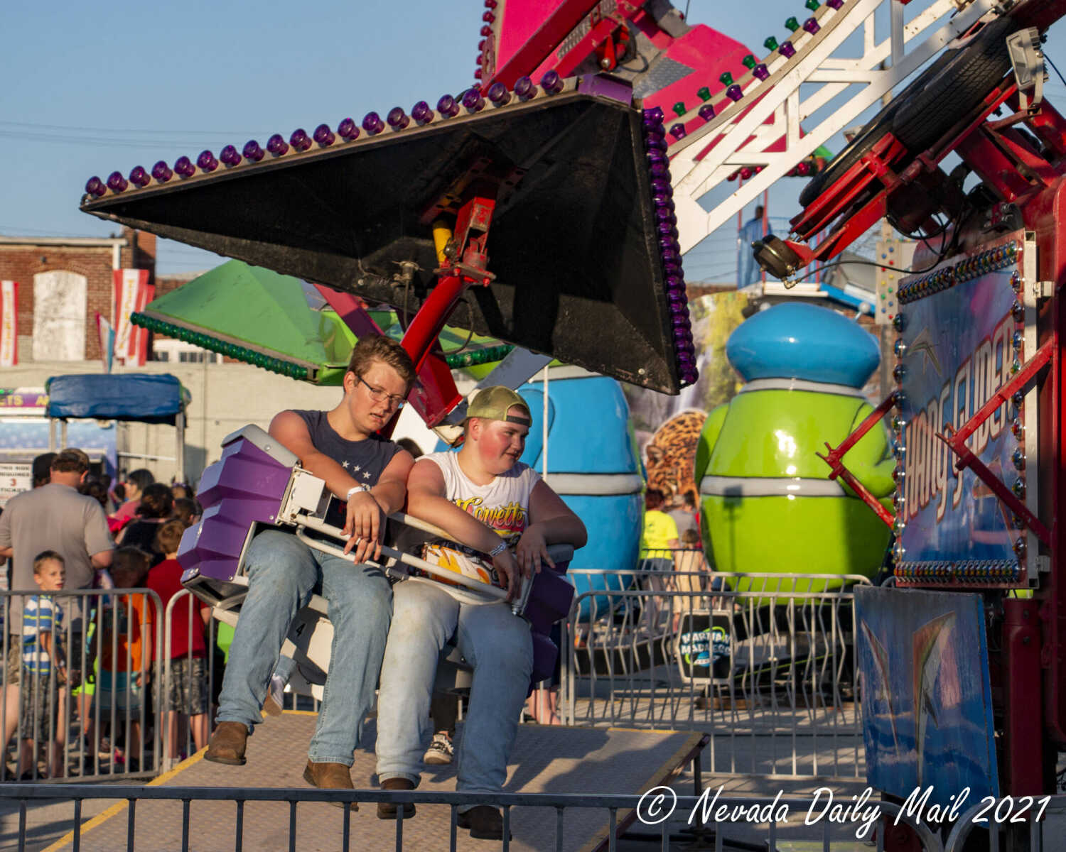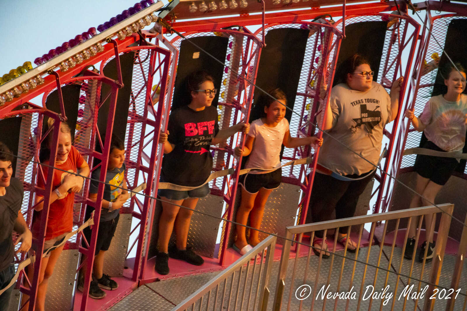 The faces of the two girls in the front seat says pure delight while upside down on a carnival ride Saturday evening. For one of the riders in the second row, not so much. -