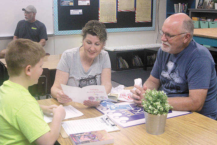 Tyler Davis, left, Lil Davis and Lavon Davis look at some of the information at Grandparents Day festivities Tuesday morning at Truman Elementary School. The grandparents were invited to bring their grandchildren early for breakfest and to visit the Scholastic Book Fair. Lil Davis said the event was really nice. -