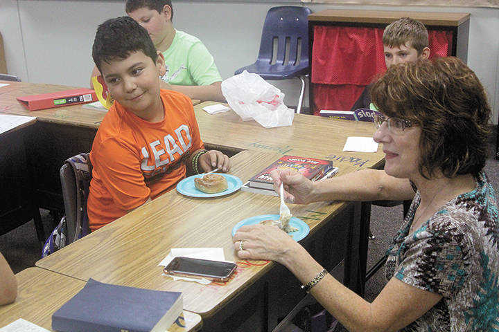 Dominic Zermeno and grandmother Kathy Butler, enjoy their cinnamon roll Tuesday morning. Truman will also host grandparents on Wednesday and Thursday morning.