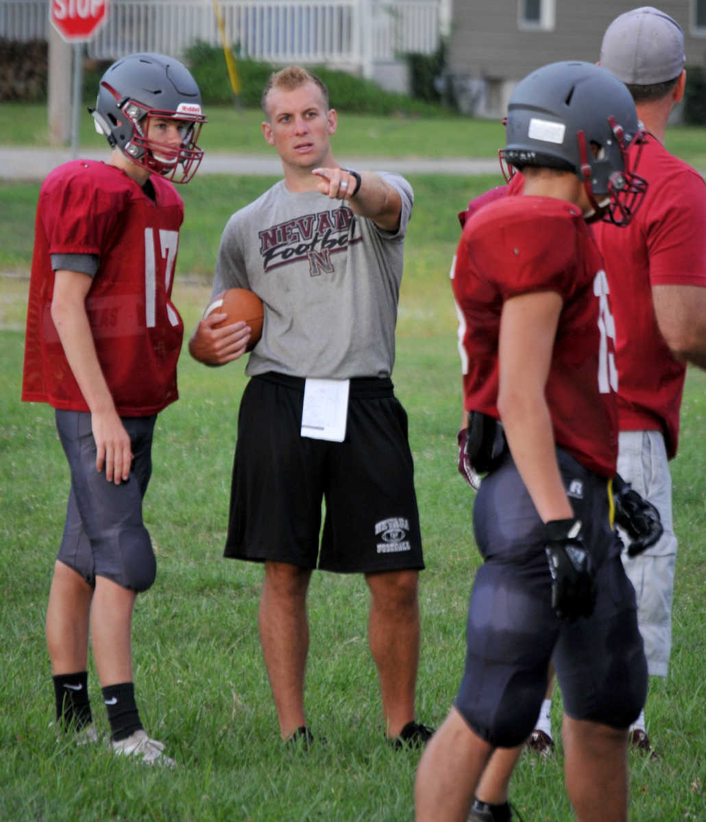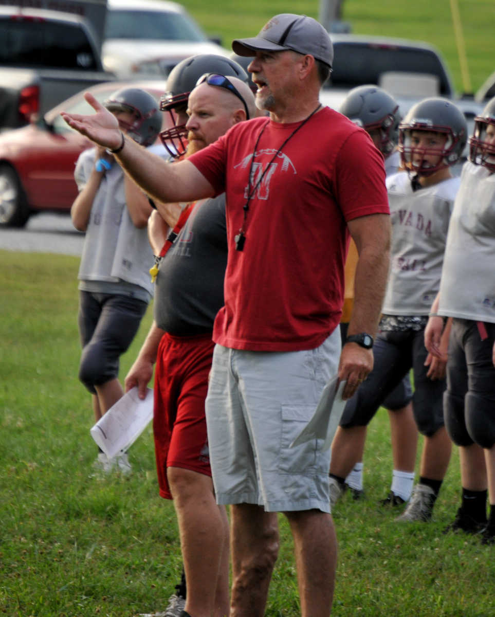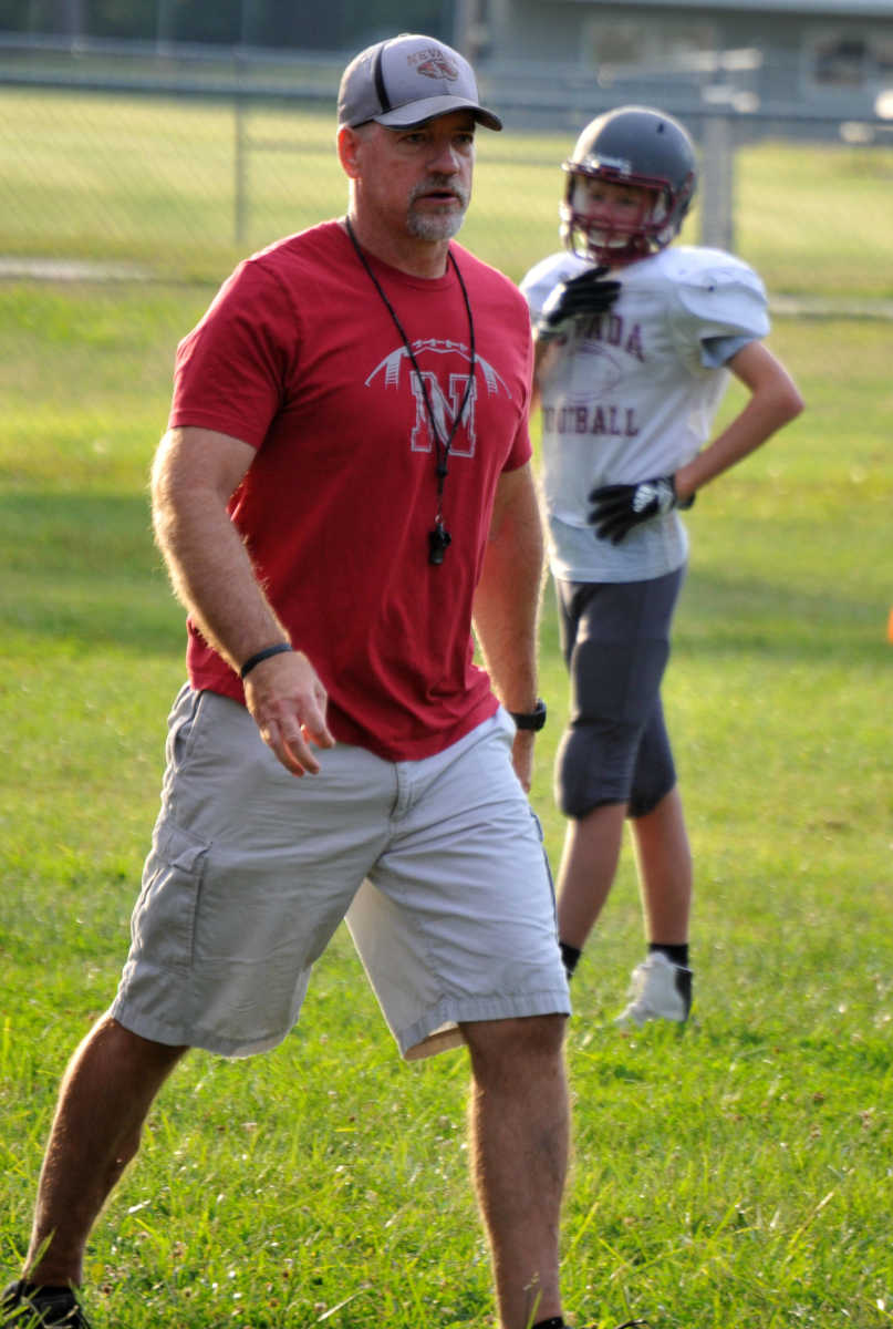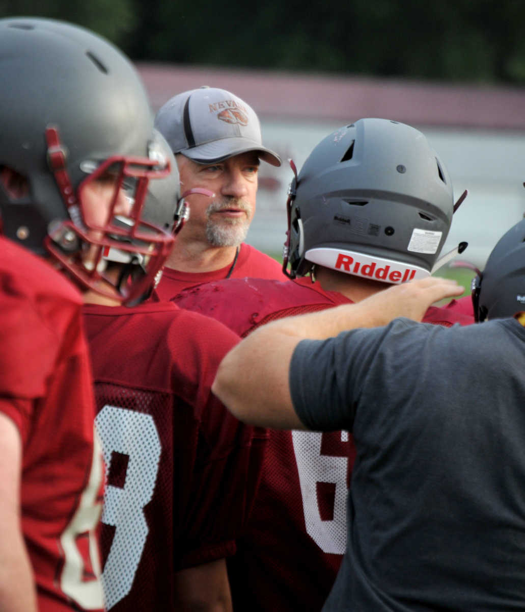Nevada High head varsity football coach Wes Beachler huddles the troops during Wednesday morning's team camp. (Matt Resnick | Daily Mail) -
