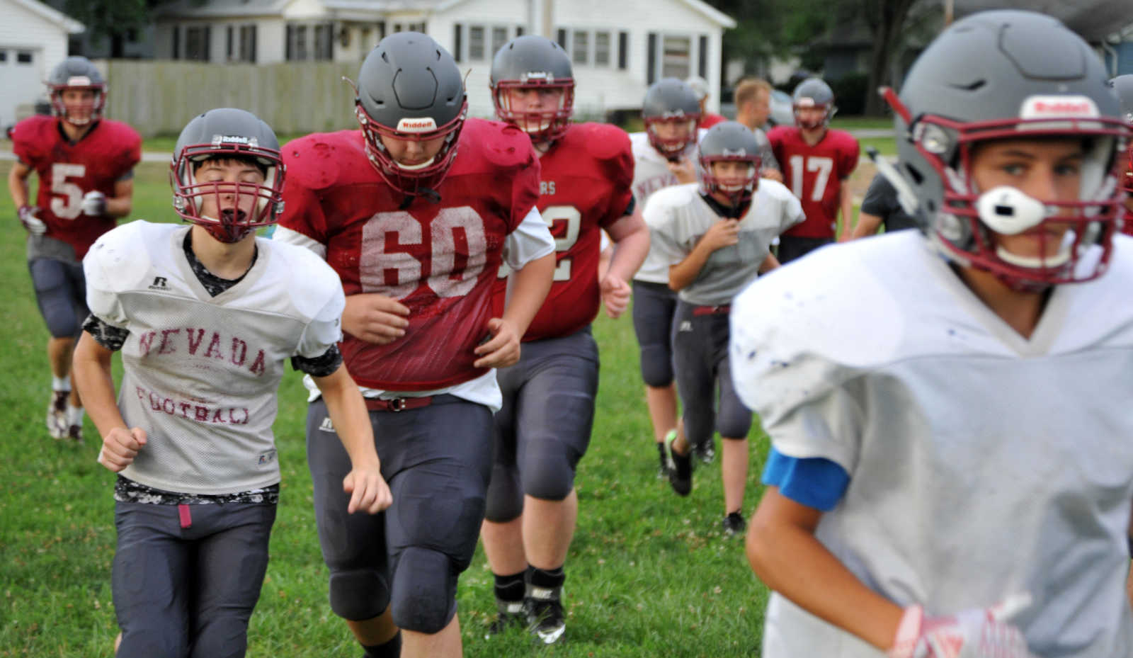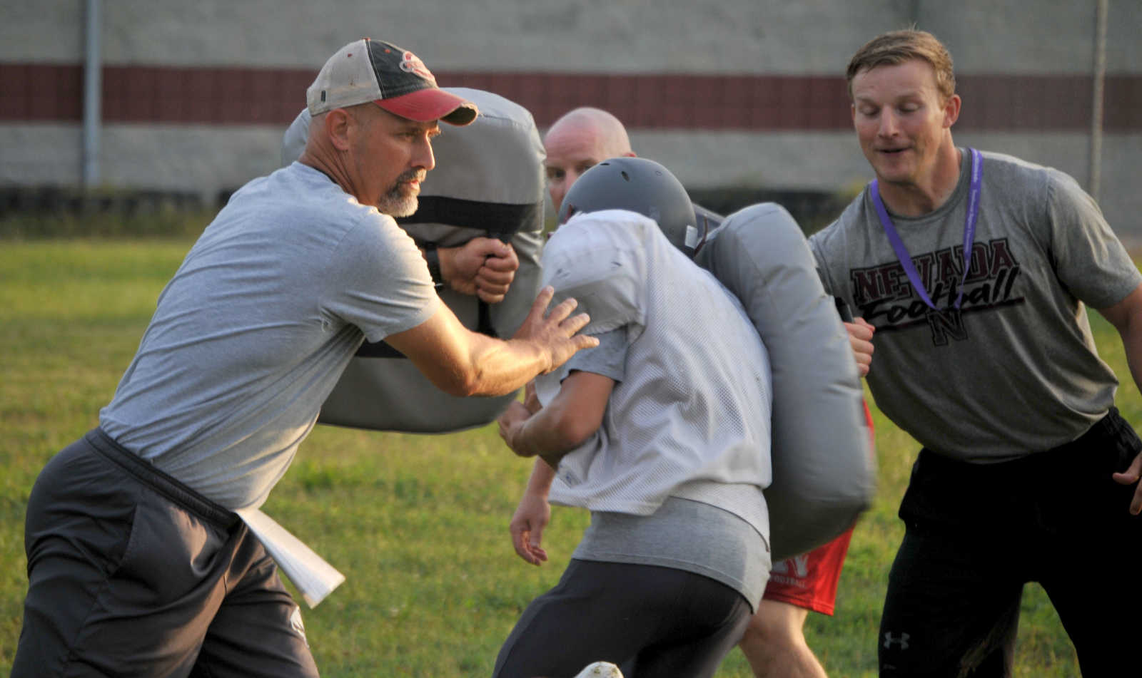 Nevada High gridders go through a full-contact drill Wednesday morning. (Matt Resnick | Daily Mail) -