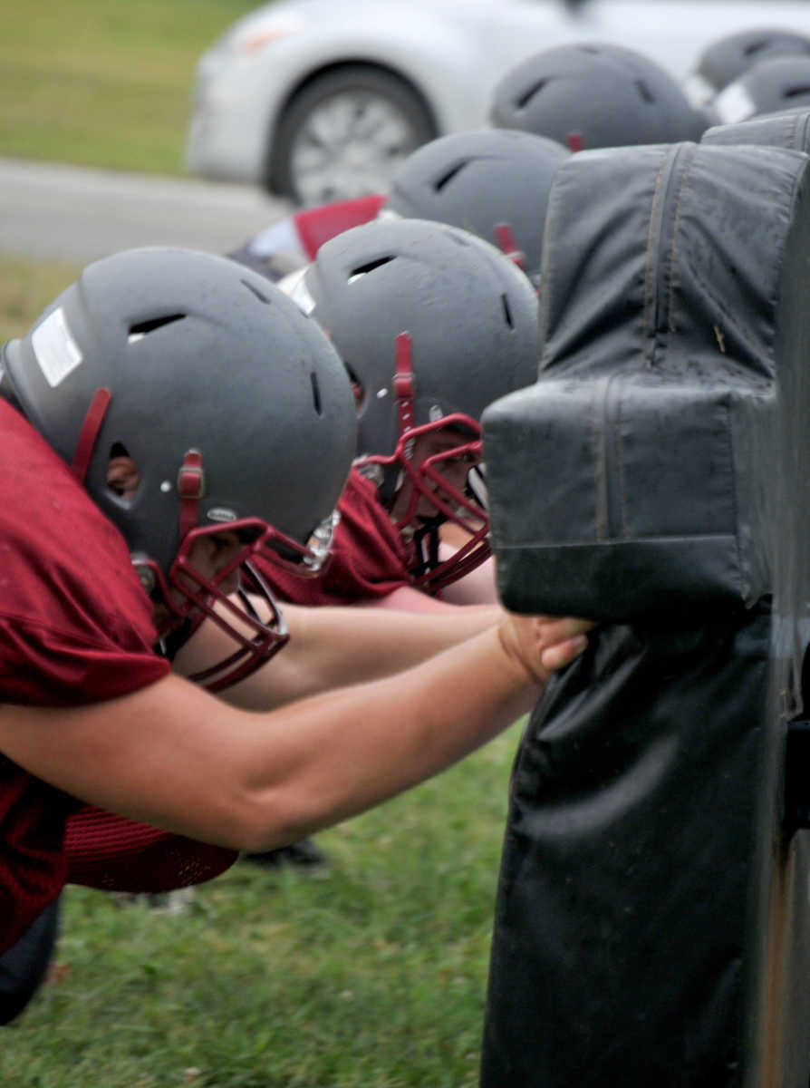 Coach Forrest Drury displays his blocking technique skills Wednesday. (Matt Resnick | Daily Mail) -