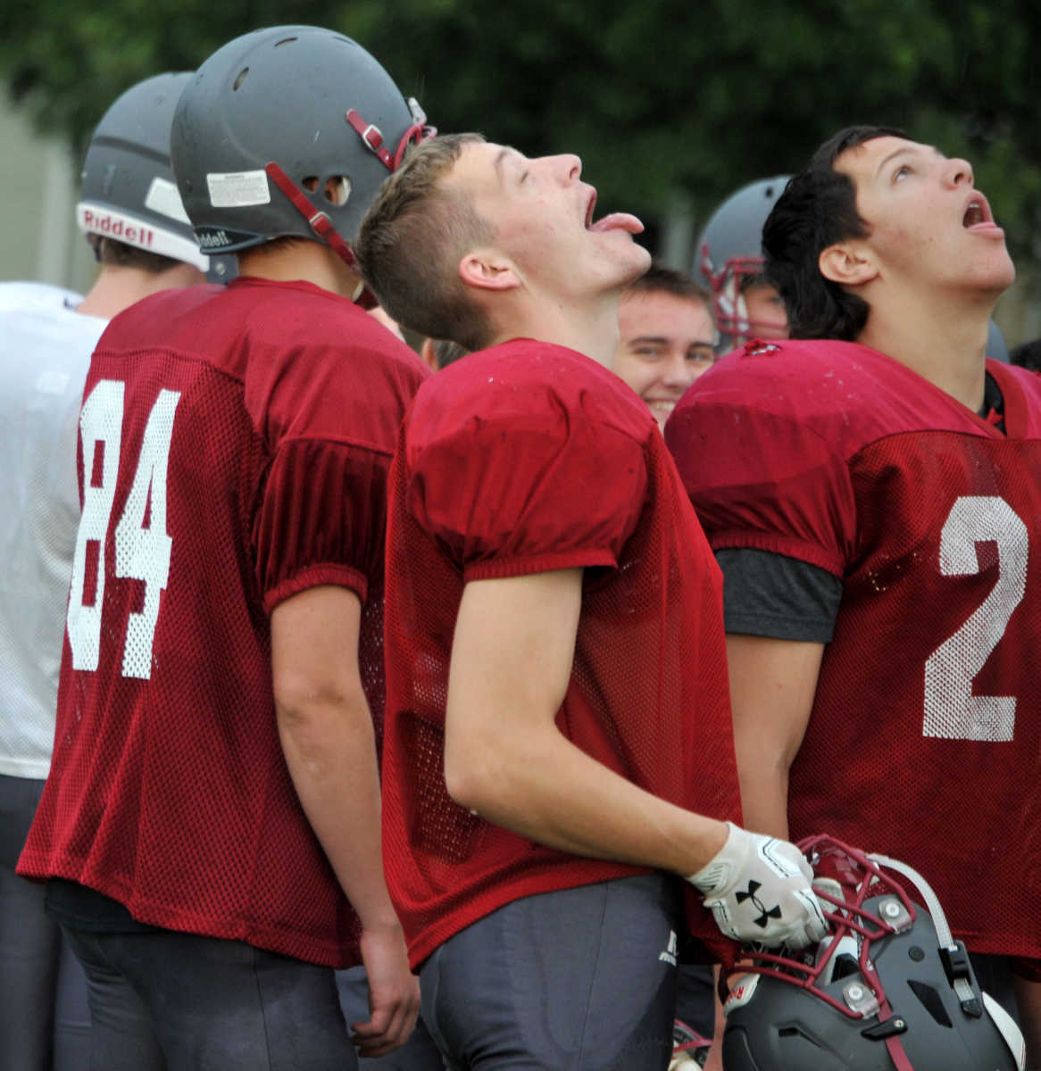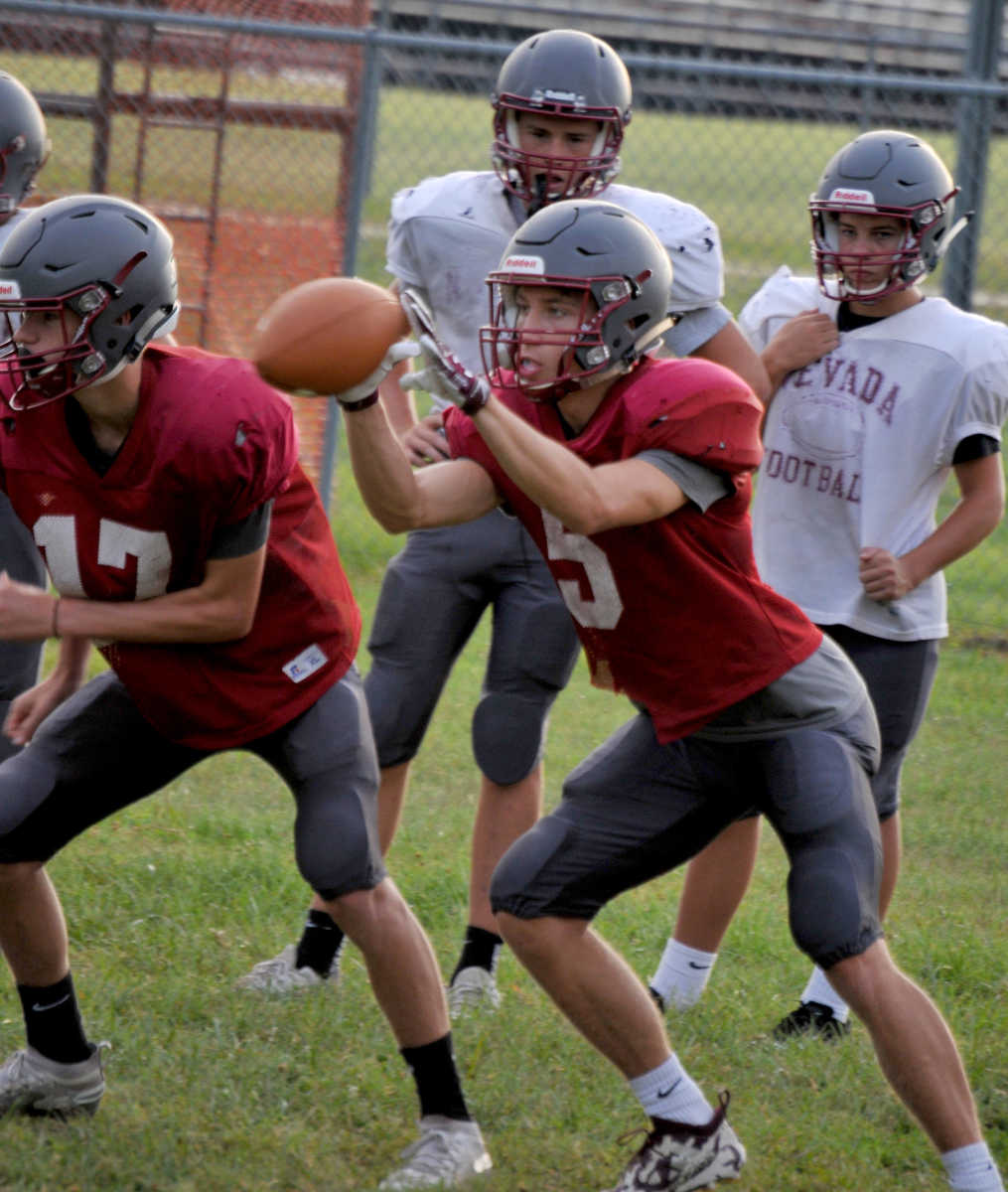 Nevada High gridders make a beeline for the water bottles, during a break in action Wednesday morning. (Matt Resnick | Daily Mail) -