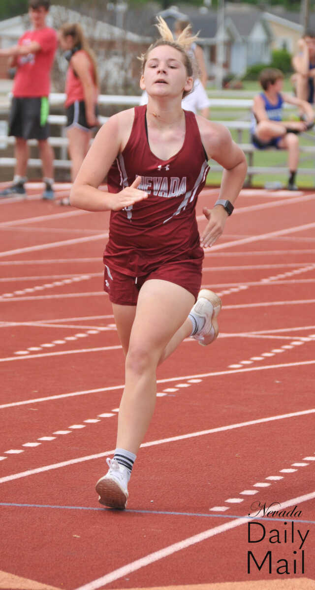 Nevada Middle School's Addison McInroy hustles through the seventh-grade girls 400-meter dash at the Big 8 Conference track and field meet Saturday in Lamar. (Photo by Hank Layton | Daily Mail Sports Reporter) -