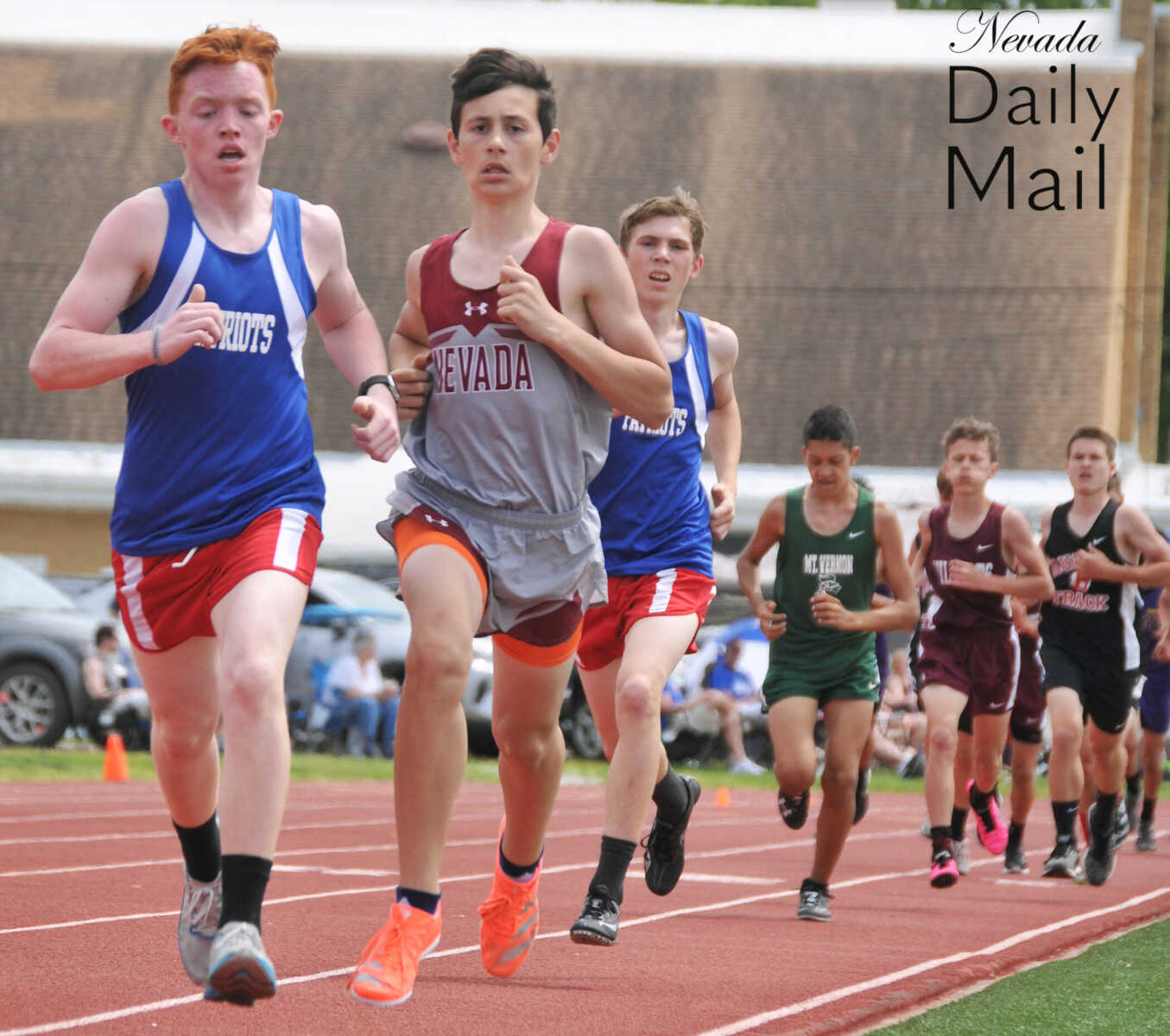 Nevada Middle School's Aiden Watts helps lead the pack in the eighth-grade boys 1,600-meter run at the Big 8 Conference track and field meet Saturday in Lamar. (Photo by Hank Layton | Daily Mail Sports Reporter) -
