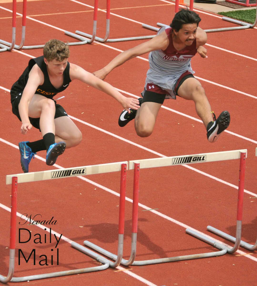Nevada Middle School's Anthony Pizano (right) bounds over the barrier during the eighth-grade boys 100-meter hurdles competition at the Big 8 Conference track and field meet Saturday in Lamar. (Photo by Hank Layton | Daily Mail Sports Reporter) -