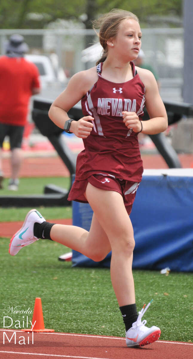 Nevada Middle School's Averi Dawn strides through the eighth-grade girls 1,600-meter run at the Big 8 Conference track and field meet Saturday in Lamar. (Photo by Hank Layton | Daily Mail Sports Reporter) -