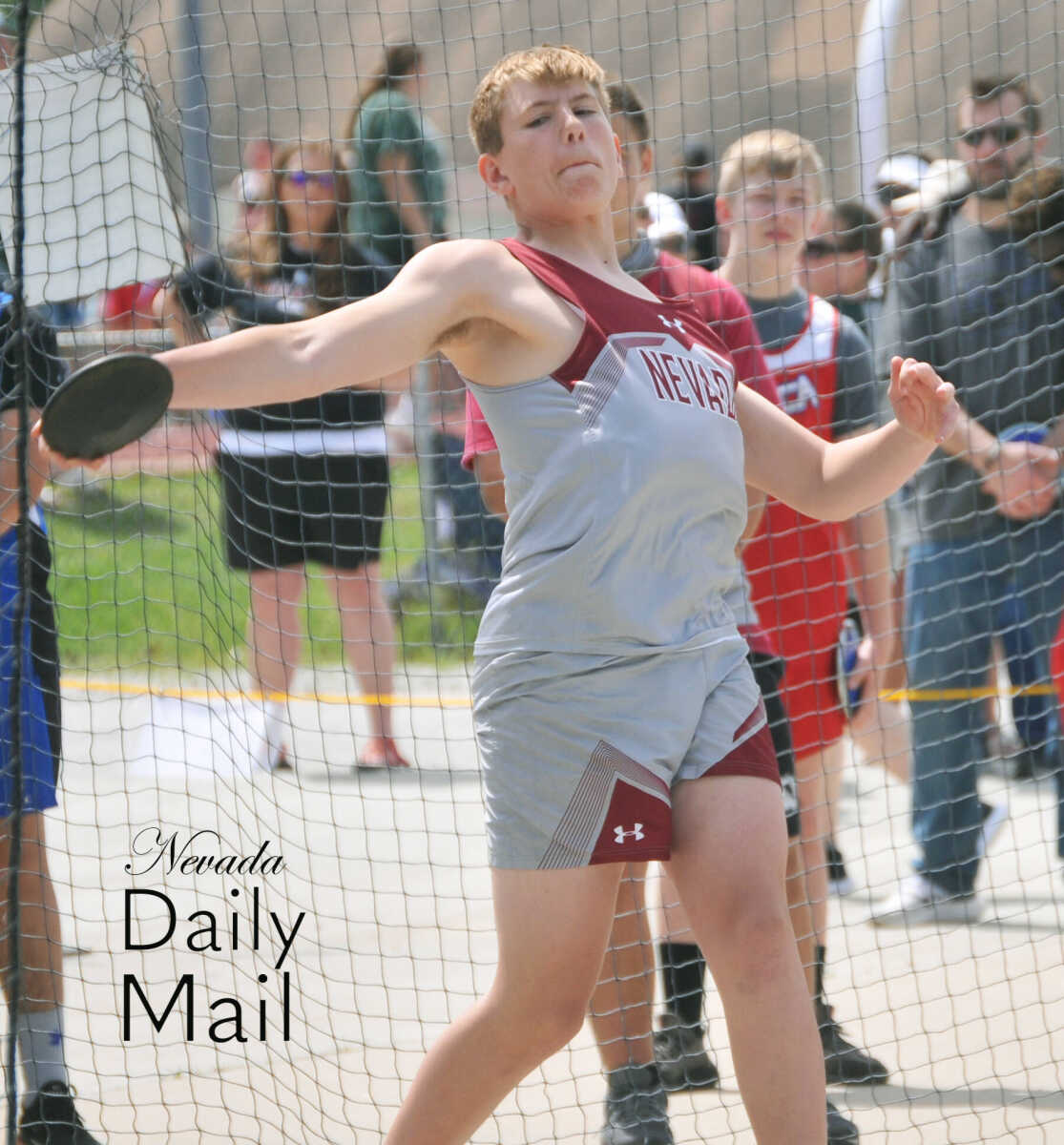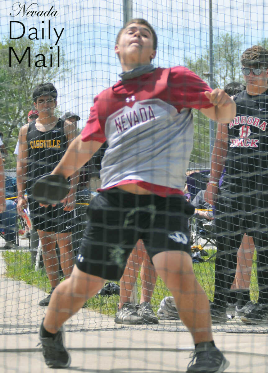 Nevada Middle School's Grady Stewart unfurls a throw during the eighth-grade boys discus competition at the Big 8 Conference track and field meet Saturday in Lamar. (Photo by Hank Layton | Daily Mail Sports Reporter) -
