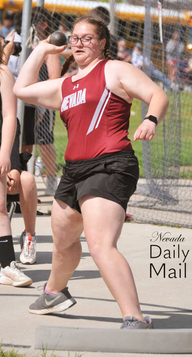 Nevada Middle School's Drew Leer unleashes a throw during the seventh-grade girls shot put event at the Big 8 Conference track and field meet Saturday in Lamar. (Photo by Hank Layton | Daily Mail Sports Reporter) -