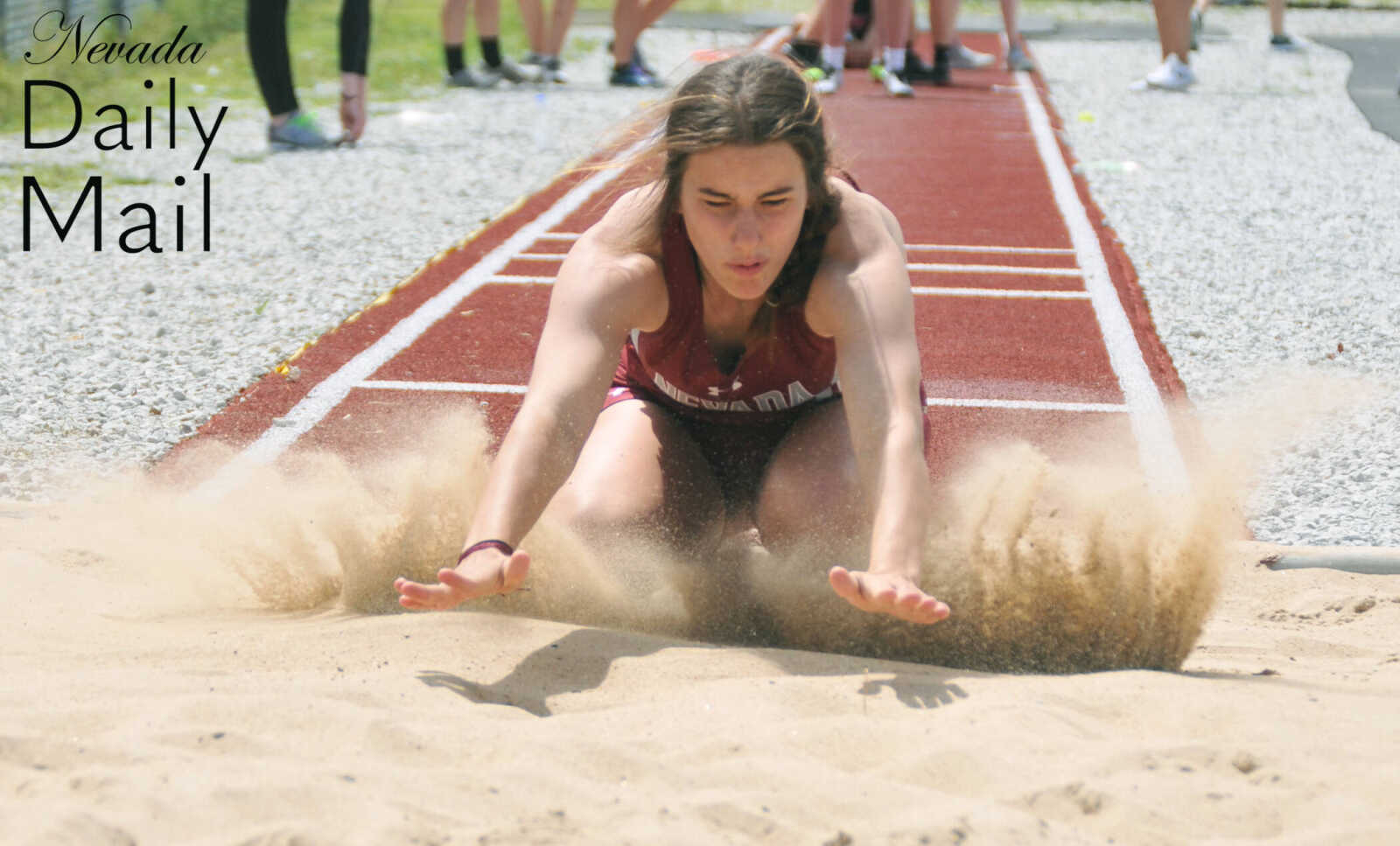 Nevada Middle School's Ella Heathman lands in the pit during the eighth-grade girls long jump event at the Big 8 Conference track and field meet Saturday in Lamar. (Photo by Hank Layton | Daily Mail Sports Reporter) -
