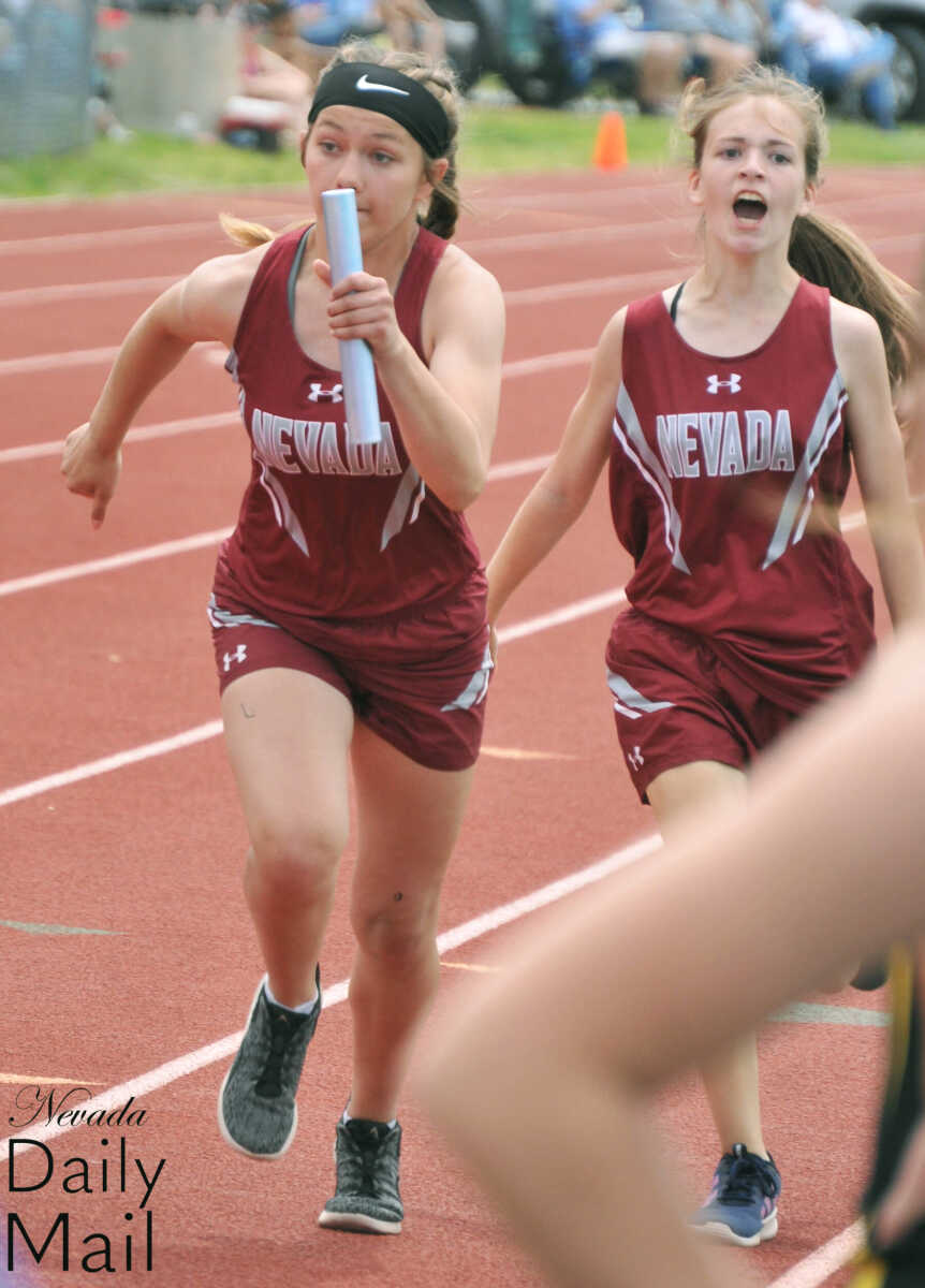 Nevada Middle School's Avery Barmann (right) cheers on teammate Freyja Sherman in the seventh-grade girls 4x200-meter relay at the Big 8 Conference track and field meet Saturday in Lamar. (Photo by Hank Layton | Daily Mail Sports Reporter) -