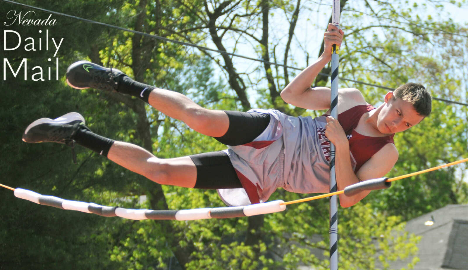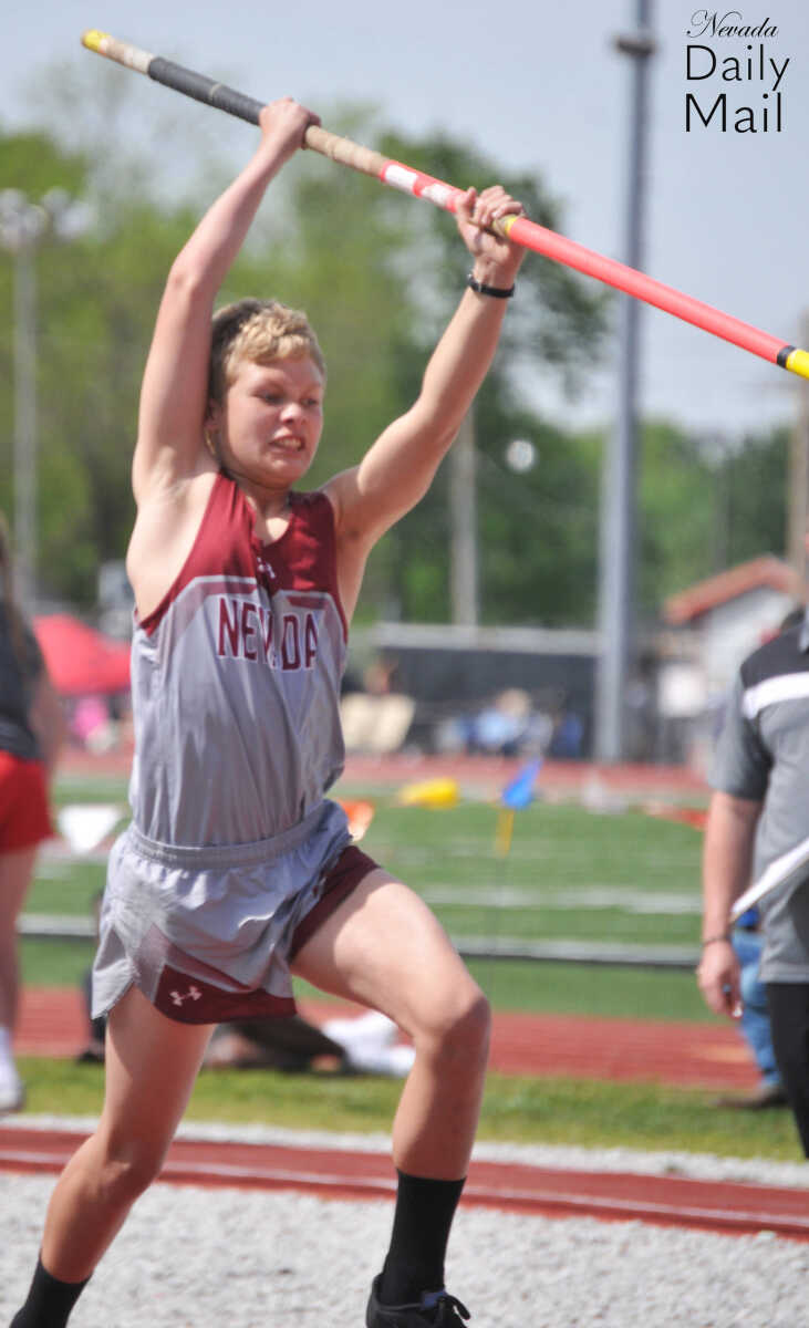 Nevada Middle School's Lane Lyon clears the mark during the eighth-grade boys pole vault event at the Big 8 Conference track and field meet Saturday in Lamar. (Photo by Hank Layton | Daily Mail Sports Reporter) -