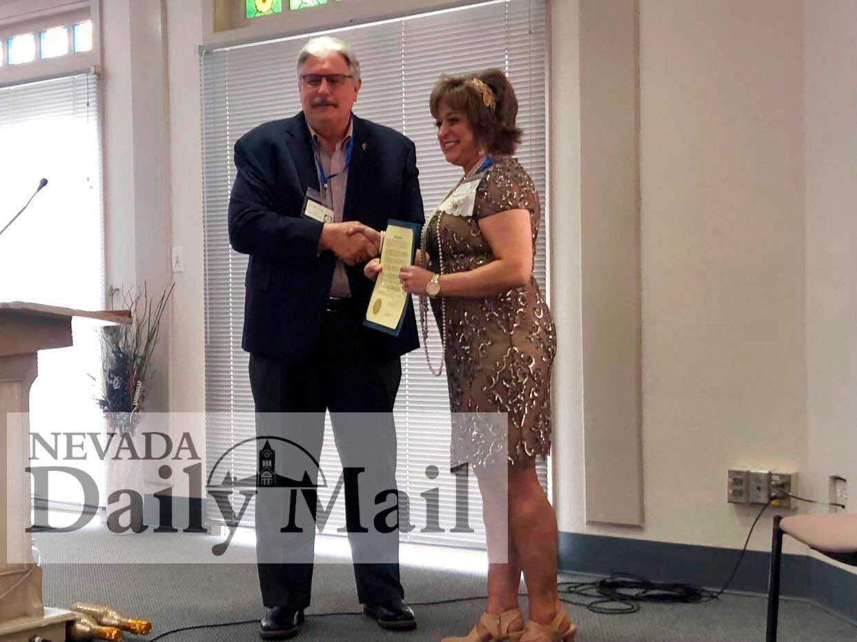 Nevada Mayor George Knox presents P.E.O. Chapter DW President Deborah Ernsbarger with the proclamation. (Photo by Sarah Haney | Daily Mail Editor) -
