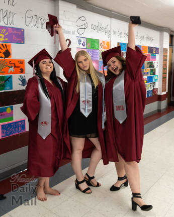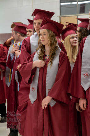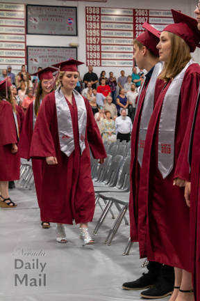 Graduates line up in the high school commons before graduation at Nevada High School on Sunday. -