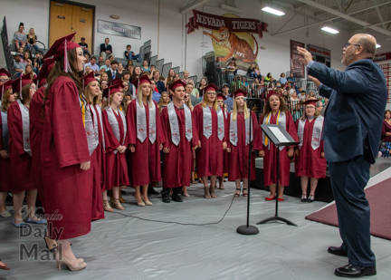 Senior members of the Nevada High School choirs, flanked by some of their junior classmates, are lead by director Wes Morton in singing "Bridge over Trouled Water." -