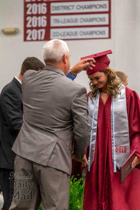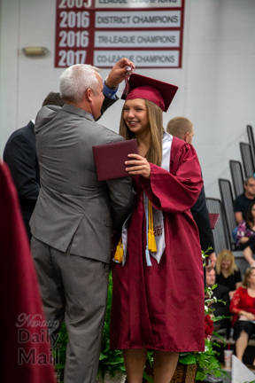 Superintendent Tyson Beshore turns Heaven Farmer's tasel during graduation at Nevada High School on Sunday. -