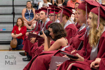 Hallie Short kneels between rows of graduating seniors to take a photograph during graduation at Nevada High School on Sunday. -