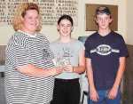 Jennifer Thomas, 28th Circuit juvenile officer and board member of the Children's Center of West Central Missouri, receives a donation of $620 from members of the Millennium 4-H who have voted to make raising funds for the Children's Center a year-long project. From left: Jennifer Thomas, Lindsay Baldwin, and Ethan Baldwin...