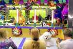 Sue Miller, left, behind the booth, and her husband, Johnny, right, behind the booth, work as hosts at a game. In the game, players compete with one another by shooting a stream of water at the flowers, which causes monkeys on a pedestal to rise. The player whose monkey reaches the top first wins. The Millers own the carnival that's in town for Bushwhacker Days, Miller's Spectacular Shows... -