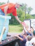 Watermelon feed Above, Doug Vantellman of Producers Grain hands out generous portions of fresh watermelon to an eager crowd of fair participants at the Vernon County Youth Fair Friday afternoon. -