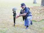 Mike Dines, of Appleton City, adds his personal dog tags to the "soldier's cross." The upturned rifle with the helmet, along with the dog tags and a pair of boots, which Dines added later, represents the graves of fallen comrades-in-arms. Left, members of the Don E. ... -