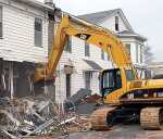 Workers from JRB Industries, a Parsons, Kan.- based company specializing in the demolition of older structures, begin the job of tearing down the old Milster Funeral Home to make way for a Family Video Store, which is to be built on the site. Work started about 4 p.m., and by 4:30 a large crowd of onlookers had gathered in adjacent parking lots. ... -