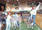Above, at a donkey basketball fund-raiser at Bronaugh High School on Sunday evening, one donkey basketball participant clings to his mount with his legs while trying to rebound a missed shot during play. In order to steal the ball from the other team or to take a shot, participants had to be riding the donkeys. ... -