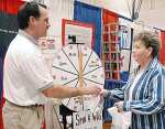 Bill Foster, Bill Foster State Farm Insurance, presents Joy Preston the prize she won Friday, during the 19th annual Home & Leisure Show. Several local businesses offered games and activities for passers-by at the event, including the Nevada Daily Mail's own paper toss game... -