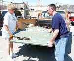 Frankie Davis, left, and Mike Seitz, Main Street Nevada president, load the old sign from the gateway to downtown into a truck. The old sign has deteriorated from the weather and needs to be replaced. Saturday afternoon, Davis and several other area master gardeners, as well as Main Street Nevada board members, spent several hours sprucing up the gateway area in the 100 block of West Austin Boulevard to prepare for a two-day training course on April 27 and 28 for Main Street volunteers from all over Missouri.. ... -
