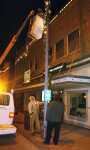 Nevada parks maintenance employees hang Christmas decorations on the light poles around the Nevada Square, Wednesday evening. Above, Mark Moberly and Jason Pike on the ground and Rick Conner in the bucket. -