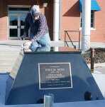 Mark Baldwin, owner of Brophy Monument Company puts some finishing touches on the base of the soon-to-be erected statue of Finis Moss, by Sandra Van Zandt, in front of the Nevada Public Library. Baldwin said he expects the 300-pound statue to be shipped sometime around Jan. 15 and will be erected as weather permits... -
