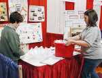 Kay Wetter, left, and Chancy Glenn, right, set up the booth Thursday evening for the Myrtle Tree Christian School at the annual KNEM/KNMO Home Show at Nevada Middle School. Glenn is the administrator of the school, which is in its first year of operation in Rich Hill, serves about 60 students from daycare through the 12th grade... -