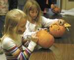 Nevada, Mo. -- Brianne Jones, left, and Katrina Penk, right, decorate pumpkins for the Second Annual Pumpkin Walk at Benton Elementary School Friday evening. Students and their parents attending had the chance to take trip throuch a hay ball maze, get a tattoo or have their faces painted. ... -