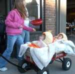 The Safe Treats Parade was held Tuesday afternoon at the Nevada Square. (Right) Erica Caldwell and Kyla Guss distribute treats to 14-month-old twins Allie and Abbi Balk during the parade Tuesday. The annual event is sponsored by Main Street Nevada. (Above) Bill Foster offers candy to 13-month-old Braedon Noel and Christine Long during the parade... -