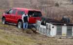 Joe Warren/Herald-Tribune Nevada, Mo. -- Two greyhounds that escaped from this overturned dog kennel trailer that overturned after skidding on ice on U.S. 71 Highway at about 11 a.m., Friday, appear to join the driver in inspecting the damage. Several greyhounds were on board and were spotted running nearby. The dogs were eventually recovered. Some ended up at Coonrod's, a short distance away, where they were kept inside to be returned to the owner. The dogs appeared to be uninjured at the time... -