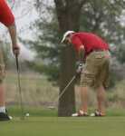 Joe Warren/Daily Mail Nevada's David Cavener (left) and Sam Moore (right) play the third hole at Frank E. Peters Municipal Golf Course Tuesday during a triangular with McDonald County and Neosho. The golfers only got to play four holes before rain and lightning canceled the event...