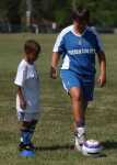Ellie Hanlon gives Devon McHugh pointers on kicking a soccer ball Friday, during the last session of the week-long Challenger Sports Soccer Camp sponsored by Nevada's parks and recreation department. Twenty-year-old Hanlon, Chester, England, said that she plays on her university soccer team as well as on a club team in England, where she is studying sports development and coaching. ... -