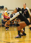Cottey freshman and former Lady Tiger Mar-Kel West, of Rich Hill, returns a serve while sophomore and former Lady Tiger Emily Moore, Nevada, and freshman and former Lady Bulldog Ashley Helm, El Dorado Springs, watch, during Saturday's match against the Fort Scott Greyhounds... -