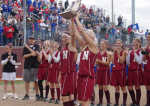 Nevada High School seniors Lexi Johnson and Jessica Neely hoist the 2010 Class 3 State Championship trophy up for the crowd as teammates and coaches look on. The Lady Tigers were down 1-0 heading into the seventh inning in Saturday's state championship game against Boonville, but tied the score in the top of that inning and went on to score three in the top of the eighth to beat the Lady Pirates by a final score of 4-3 and take the program's first-ever state championship... -