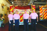 Nevada firefighters, wearing pink T-shirts to raise awareness of breast cancer, stand behind a newly striped truck in the fire house on Thursday, Oct. 28. October is National Breast Cancer Awareness Month and the Nevada Fire Department chose the last week of the month to wear the shirts in hopes of raising awareness of prevention, treatment and recognizing the risk said Capt. Tim Bullard. Left to right: Jeremy Merrick, David May, Tim Bullard and Kelly Wingert... -