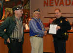 Nevada American Legion Commander Alvin Mohlfield, center, and Melvin Ladwig, 1st vice commander, present a certificate of appreciation to Nevada Interim Police Chief Casey Crain for the assistance the Nevada Police Department gave to the Legion during the celebration of the 100th anniversary of their building. The Police Department provided an escort for a motorcycle parade down Austin Boulevard during their celebration... -