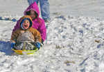 Seven-year-old Ally Turner and 4-year-old Zack Turner take a slide down a hill at Radio Springs Park, Nevada, Thursday afternoon. The slippery slope was "just right" and clearly, the two enjoyed the experience. Younger brother Patrick, who's 1, (not pictured) was less impressed with the idea, but seemed to be enjoying the outing anyway. ... -