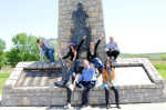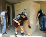Joe Sunthimer watches as Jeremy (center) and Enos Davis jockey a Twister Safe storm shelter into its final position on the back porch of the 12th Habitat for Humanity house built in Nevada. The Twister Safe company is based in Neosho, Mo.; and this is the second storm shelter they have provided for a Habitat house at their cost. ... -